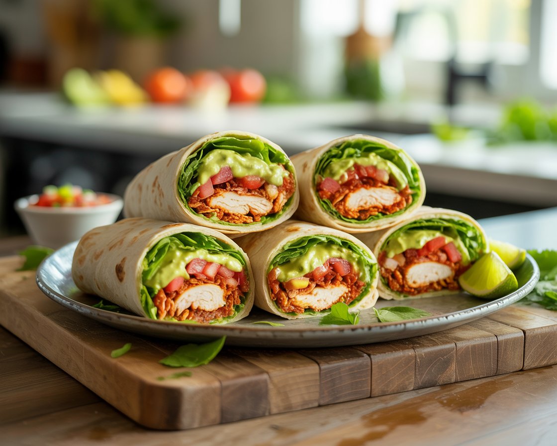 Diese Wraps kombinieren mageres Hühnchen mit frischen Tomaten, knackigem Salat und einer cremigen Joghurt-Sauce – perfekt für alle, die eine leichte, aber proteinreiche Mahlzeit suchen.