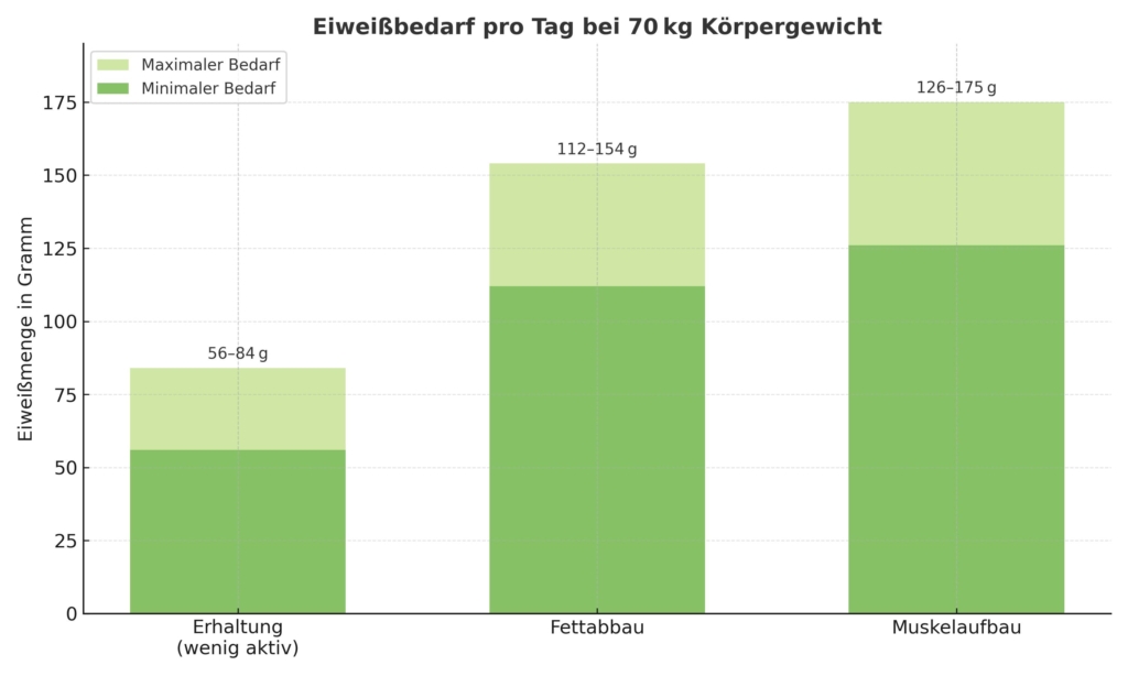 Der Eiweißbedarf hängt von deinem Körpergewicht, Ziel und Aktivitätslevel ab. Hier die groben Richtwerte: